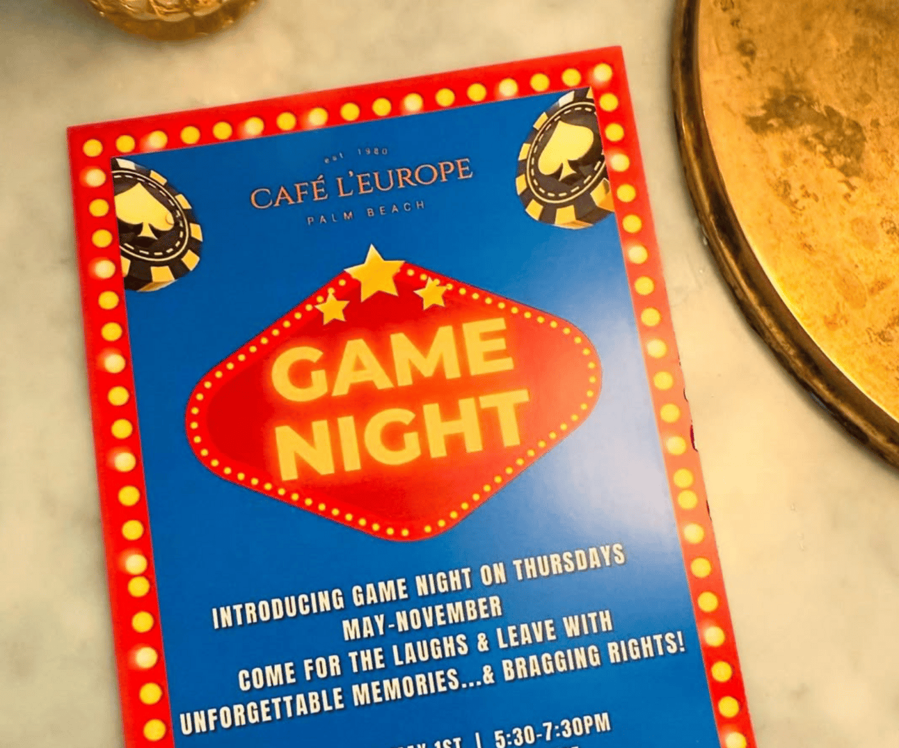 Join game night every Thursday from May through November from 5:30 pm to 7:30 pm. Enjoy dinner and drinks à la carte at Cafe L’Europe, while vying for prizes—bragging rights included! Limited capacity, valet parking available. Book your table in advance.